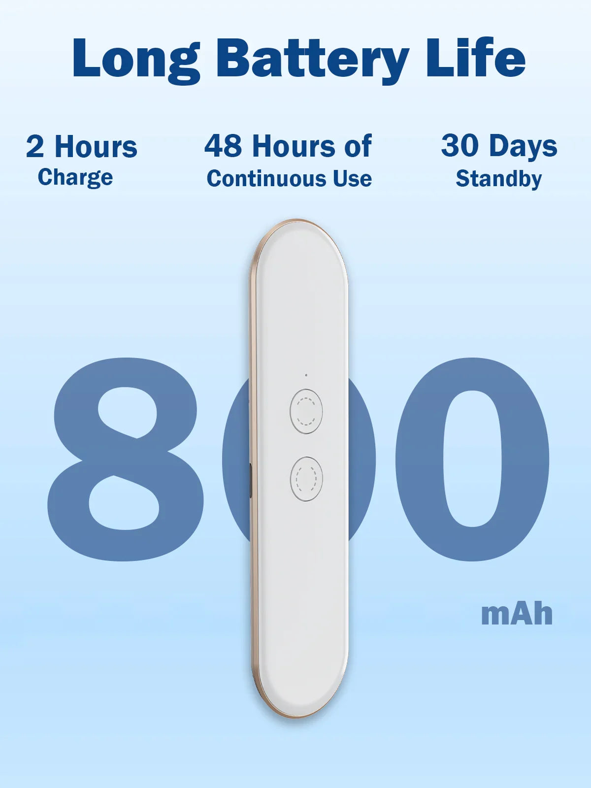 Long-lasting 800mAh battery: up to 48 hours of use or 30 days standby